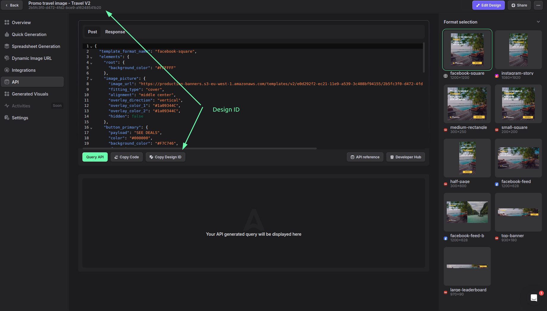 {"openapi":"3.0.3","info":{"title":"API Reference - Abyssale","version":"0.0.1"},"tags":[{"name":"Designs","description":"A design is a layout including at least:\n- one format (dimension, i.e. Facebook feed 1200x628 or IAB 300x250)\n- one element (text, button, image, shape...)\n\nAll elements have their own properties that can be customized (color, text payload, image...).\n\nOnce designed, all properties of the design will act as a reference for subsequent image generation. Obviously, those properties can be overridden by sending new parameters in the generation API call.\n\nAbyssale provides a list of free template designs in the Template Library page. Feel free to use one to start designing your design instead of doing it from scratch.\n\n**All of your designs are listed in the different project pages, only those are accessible via API.**\n"}],"servers":[{"url":"https://api.abyssale.com","description":"Main Production Server"}],"security":[{"api_key":[]}],"components":{"securitySchemes":{"api_key":{"description":"All of your Abyssale requests must contain a `x-api-key header` with your API Key.","type":"apiKey","name":"x-api-key","in":"header"}},"schemas":{"Design":{"type":"object","properties":{"id":{"type":"string","description":"Unique identifier (UUID) of the design."},"name":{"type":"string","description":"Name of the design."},"type":{"type":"string","enum":["static","animated","printer","printer_multipage"],"description":"Type of the design"},"created_at":{"type":"integer","description":"Timestamp of when the design has been created."},"updated_at":{"type":"integer","description":"Timestamp of when the design has been updated for the last time."},"category_name":{"type":"string","nullable":true,"description":"Design Category"}},"required":["id","name","created_at","updated_at"]},"DesignFormat":{"type":"object","properties":{"id":{"type":"string","description":"Unique identifier (name) of the format."},"uid":{"type":"string","description":"Unique UUID of the format"},"width":{"type":"number","description":"Width of the format"},"height":{"type":"number","description":"Height of the format"},"preview_url":{"type":"string","format":"uri","description":"Preview Image URL of the format"},"dynamic_image_url":{"type":"string","format":"uri","description":"URL of the existing dynamic image for this format."}},"required":["id","width","height"]},"DesignElement":{"type":"object","properties":{"name":{"type":"string","description":"Layer name (`root` is a special element that allows to customize the image background color.)"},"type":{"type":"string","enum":["container","text","button","image","logo","shape","illustration","rating","qrcode","chart"],"description":"Layer type"},"attributes":{"type":"array","description":"List of all attributes","items":{"type":"object","properties":{"id":{"type":"string","description":"The attribute name"},"help":{"type":"string","description":"An helper to understand what is this attribute"},"values":{"type":"object","additionalProperties":{"type":"string","description":"The value of the attribute related to a format."}}}},"required":["id","help","values"]}},"required":["name","type","attributes"]}}},"paths":{"/designs/{designId}":{"get":{"summary":"Get Design details","description":"Retrieve the details of a design (general information, formats, elements & properties).\n","tags":["Designs"],"parameters":[{"in":"path","name":"designId","schema":{"type":"string","format":"uuid"},"required":true,"description":"Unique identifier (UUID) of the design"}],"responses":{"200":{"description":"Ok","content":{"application/json":{"schema":{"allOf":[{"$ref":"#/components/schemas/Design"},{"type":"object","properties":{"formats":{"type":"array","description":"The list of formats available in the design.\n\nThe id property can be used to specify the format you would like to generate in the generation API call.\n","items":{"$ref":"#/components/schemas/DesignFormat"}},"elements":{"type":"array","description":"The list of all elements (& customizable properties) contained in the design.\n\n`name` is the layer name (root is a special element that allows to customize the image background color.)\n\n`attributes` contains the list of all customizable properties:\n- `id`: The attribute ID\n- `values`: the related value for this attribute in each format (if defined)\n","items":{"$ref":"#/components/schemas/DesignElement"}},"variables":{"type":"object","description":"Variables used within the text layers of the design.\nKeys represent variable names (without braces), and values\nrepresent the placeholder format in the design (e.g. \"{name}\").\n","additionalProperties":{"type":"string"}}}}]}}}},"404":{"description":"Design Not found"}}}}}}